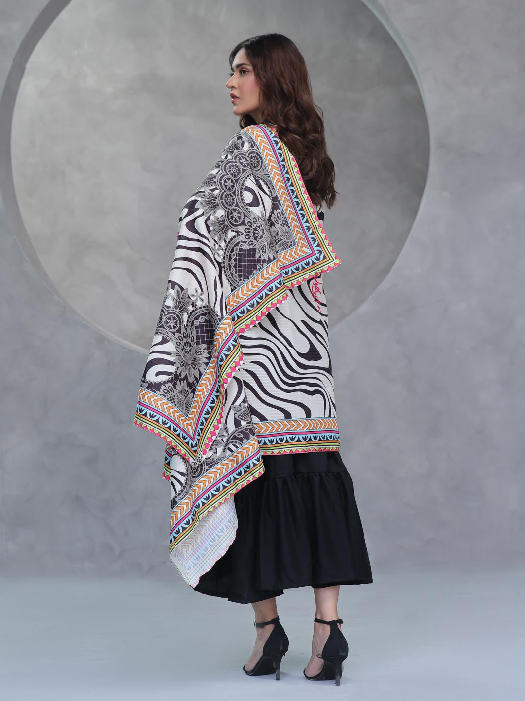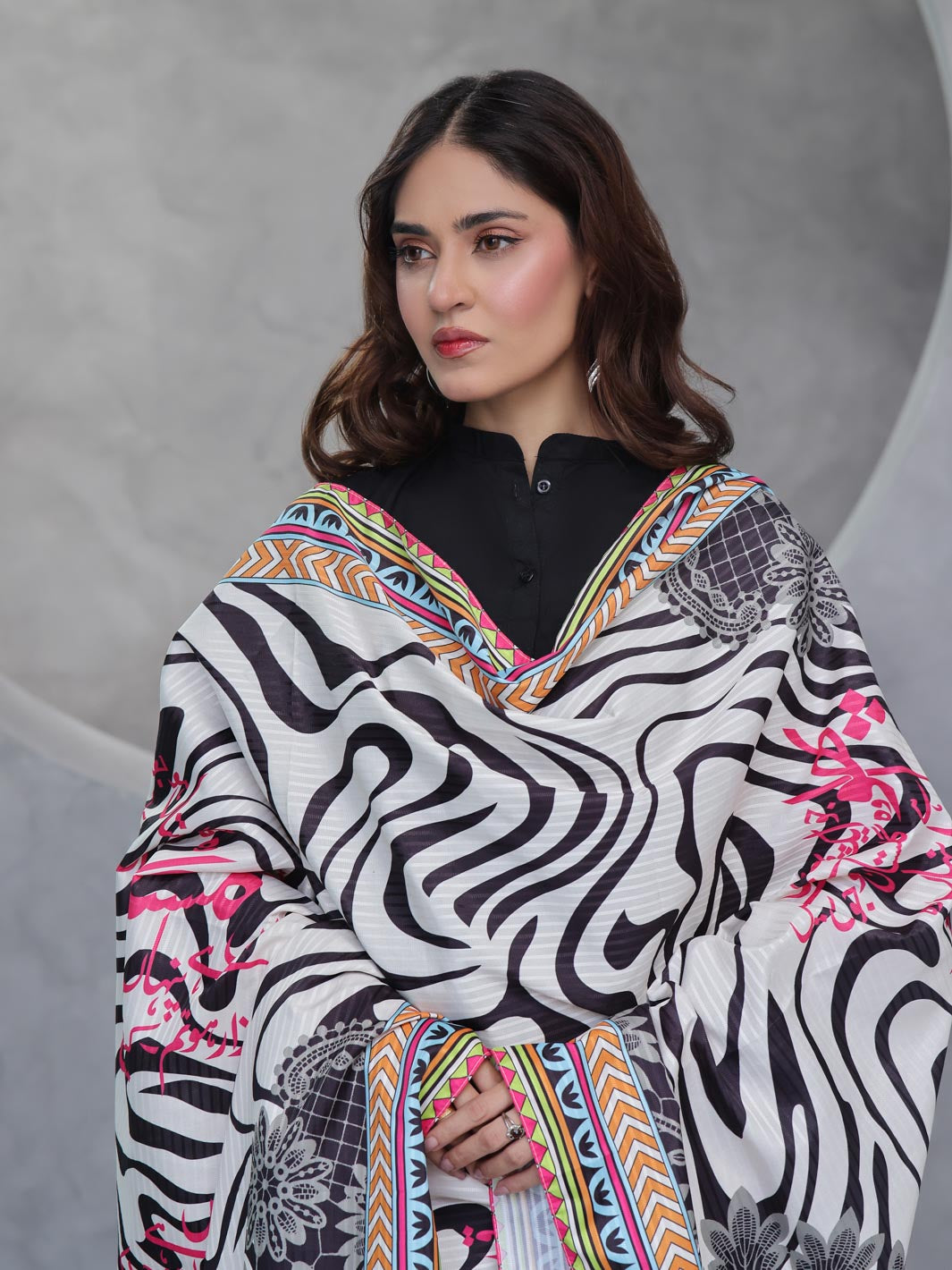A very beautiful & Stylish crafted Shawl from high quality materials. This fabric not only ensures durability, but making it an ideal choice for those seeking to enhance their wardrobe with a classic yet contemporary aesthetic & the contrasting colors enhances the fabric's versatility.